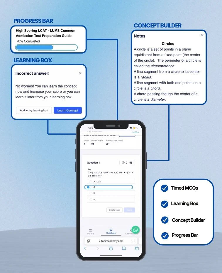 Scientific Aptitude Test Preparation - This all-in-one Package combines the study material with Innovative Tabir Methodology, ensuring that you’re ready for the LCAT and LSAT. With its focus on practice, personalized support, and fun learning, this package is the perfect companion on your road to success at LUMS. The package will ensure your admission into Syed Babar Ali School of Science and Engineering.